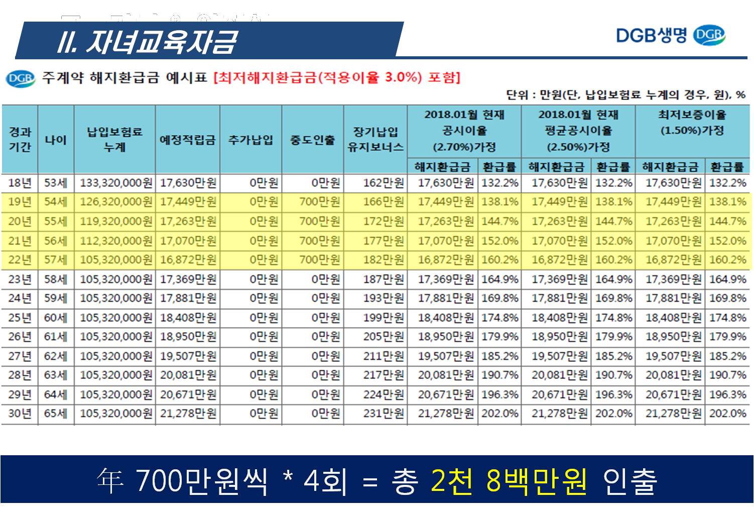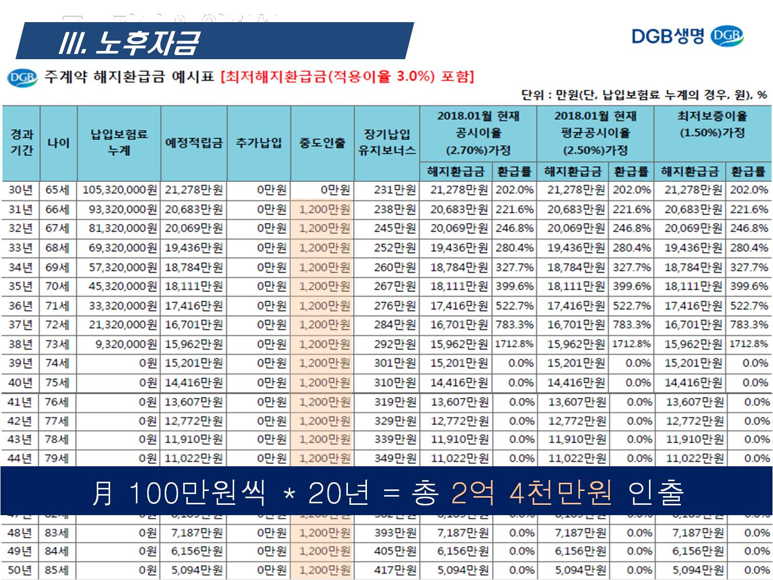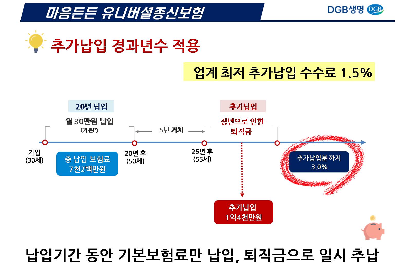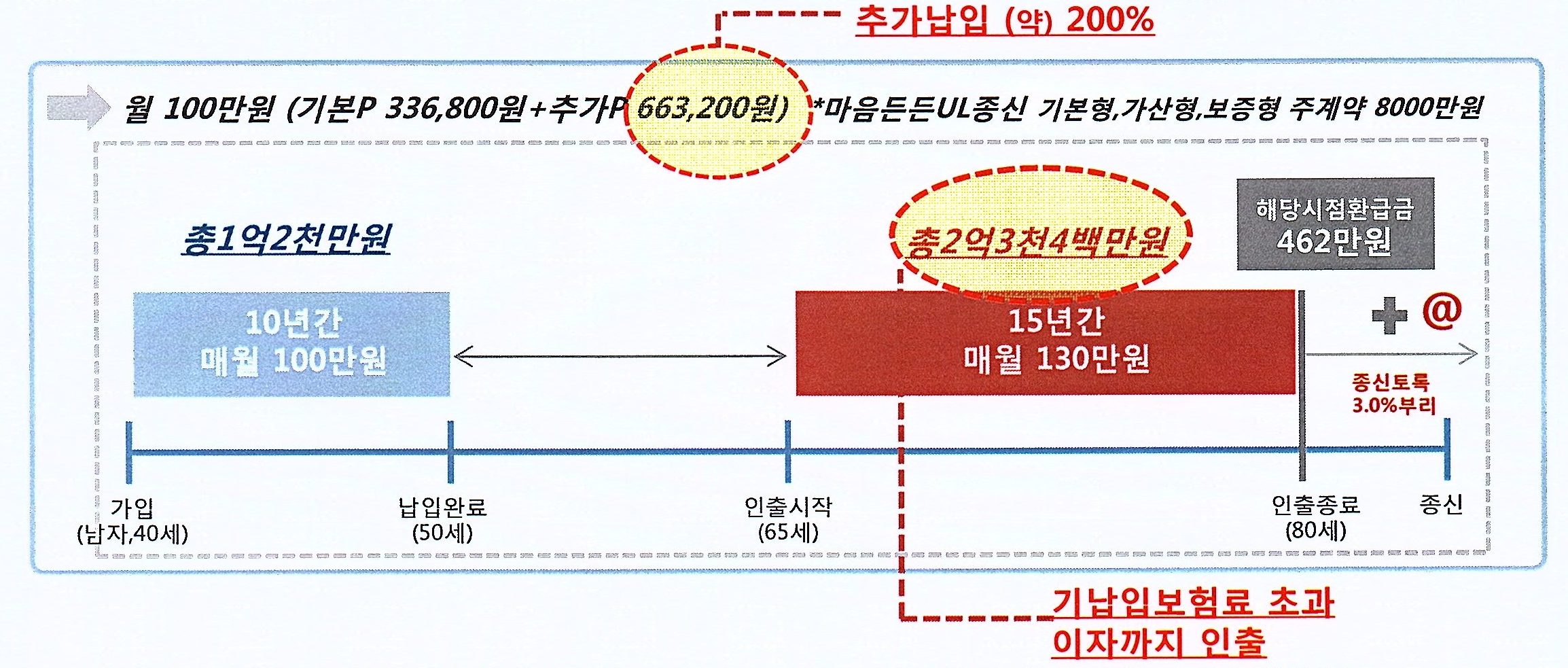 특히, 추가납입 200%에 제한문구가 없고, 추가납입한 보험료까지 동일하게 3% 최저보증이 됩니다. 또한, 계약자 적립금의 최소 200만원만 남겨두고 기납입보험료에 이자까지 모두 중도인출이 가능합니다.