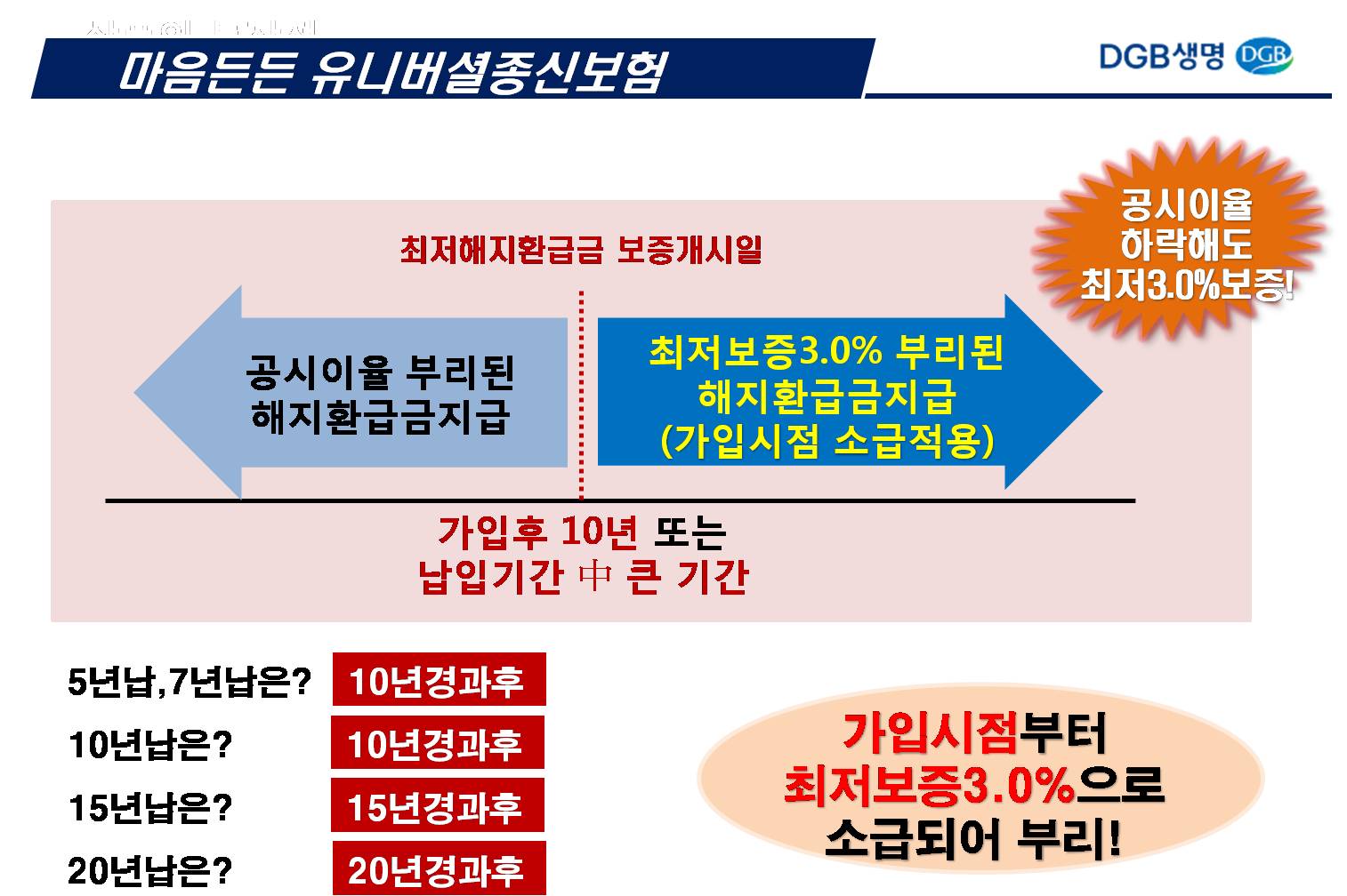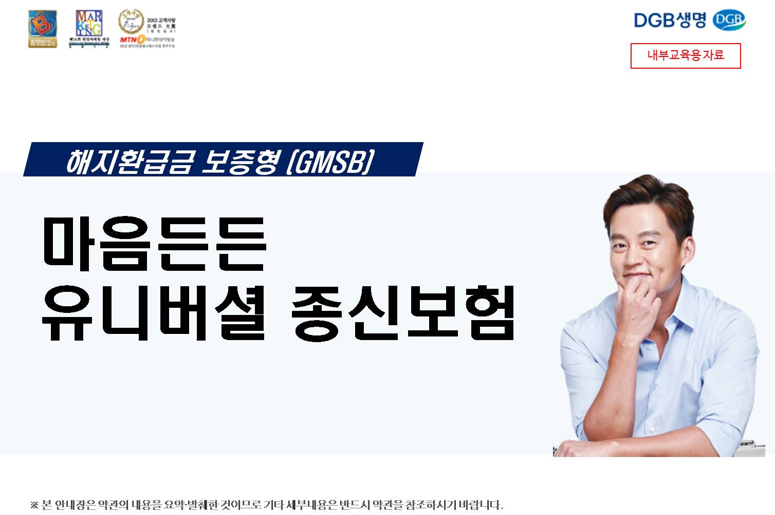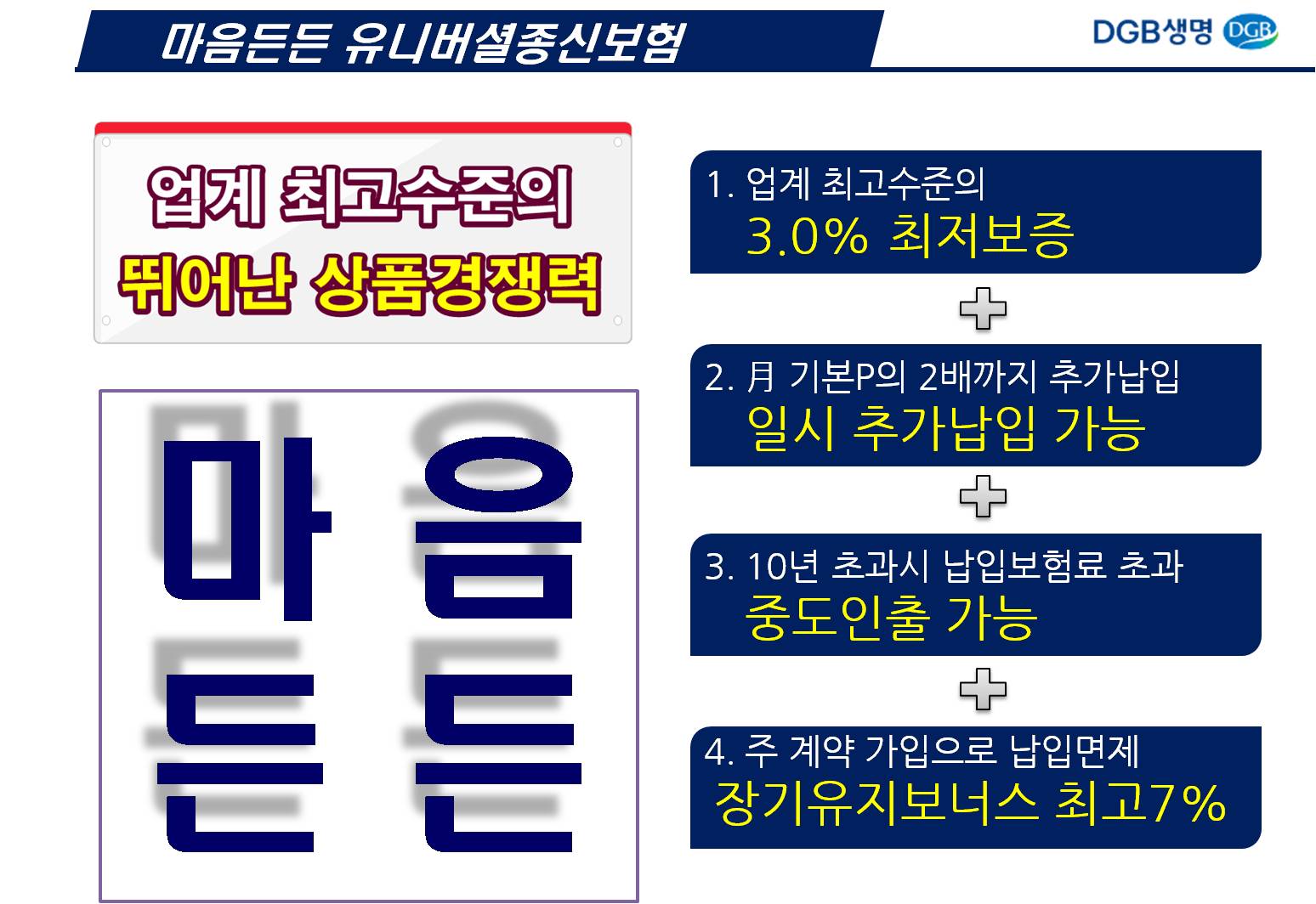 매주 각보험사 교육 팀장님들이 오셔서 교육을 해주십니다. 두달에 한번쯤 보는 교육 팀장님들인데... 이번에 다시 만난 DGB생명 교육 팀장님이 현재 판매되고 있는 종신보험중에 최저보증이율 3%, 추가납입 200%, 이자까지 중도인출 가능한 보험은 DGB생명 마음든든 유니버셜종신보험만 있다고 자랑을 하시네요.