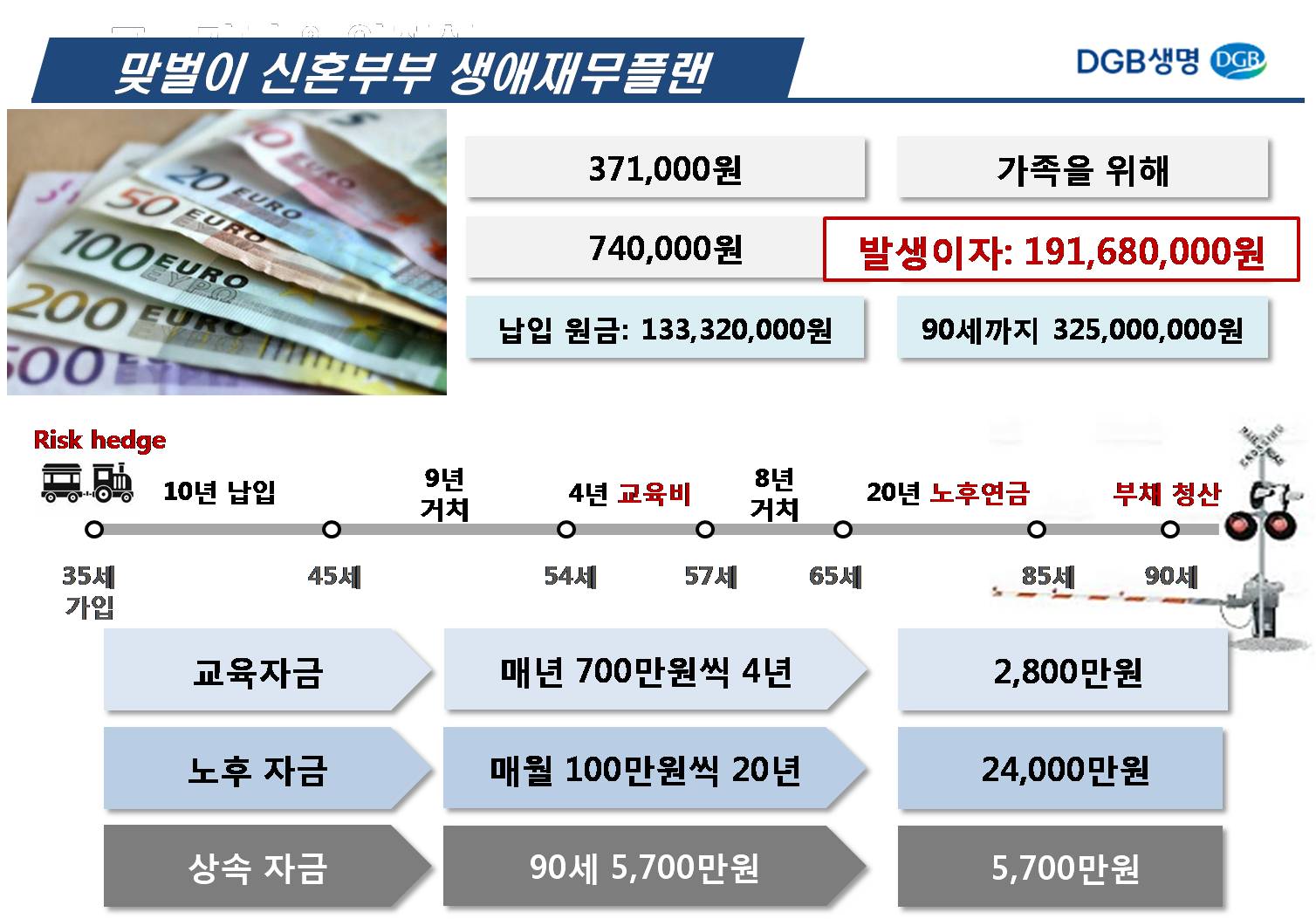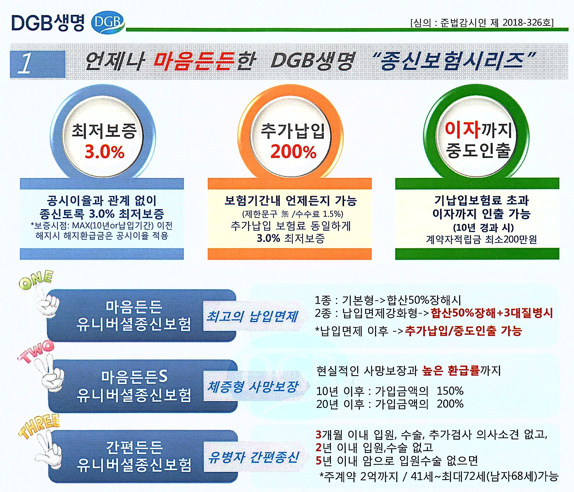 DGB생명 팜플렛으로 한장으로 정리가 잘 되어 있습니다. 위 3가지 장점을 모두 갖고 있는 종신보험 있으면 알려주세요. 보험경력 16년차 보험테크가 자신있게 추천합니다. 해약만 하지 않으면 절대 손해 볼 일이 없는 보험입니다. 돈의 가치를 가장 잘 지켜주는 종신보험에 많은 관심과 문의 주세요. 감사합니다.