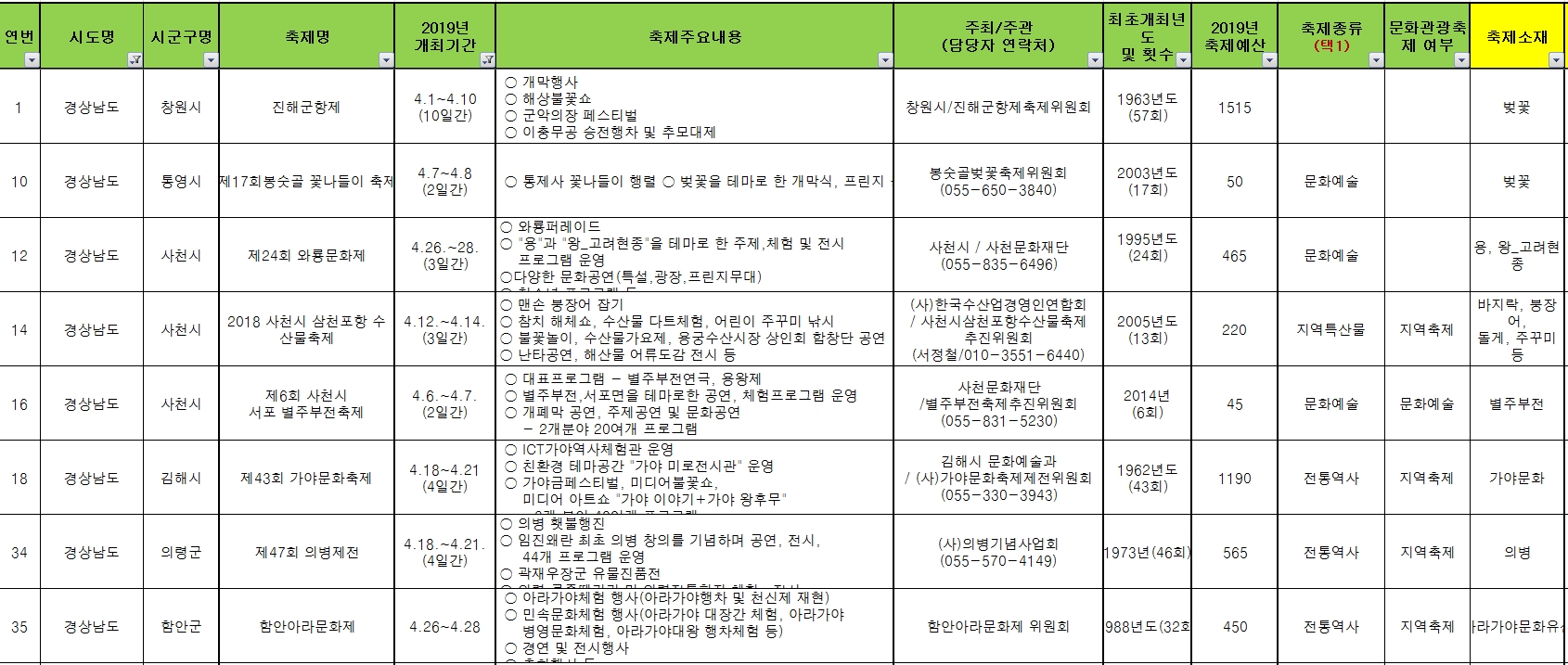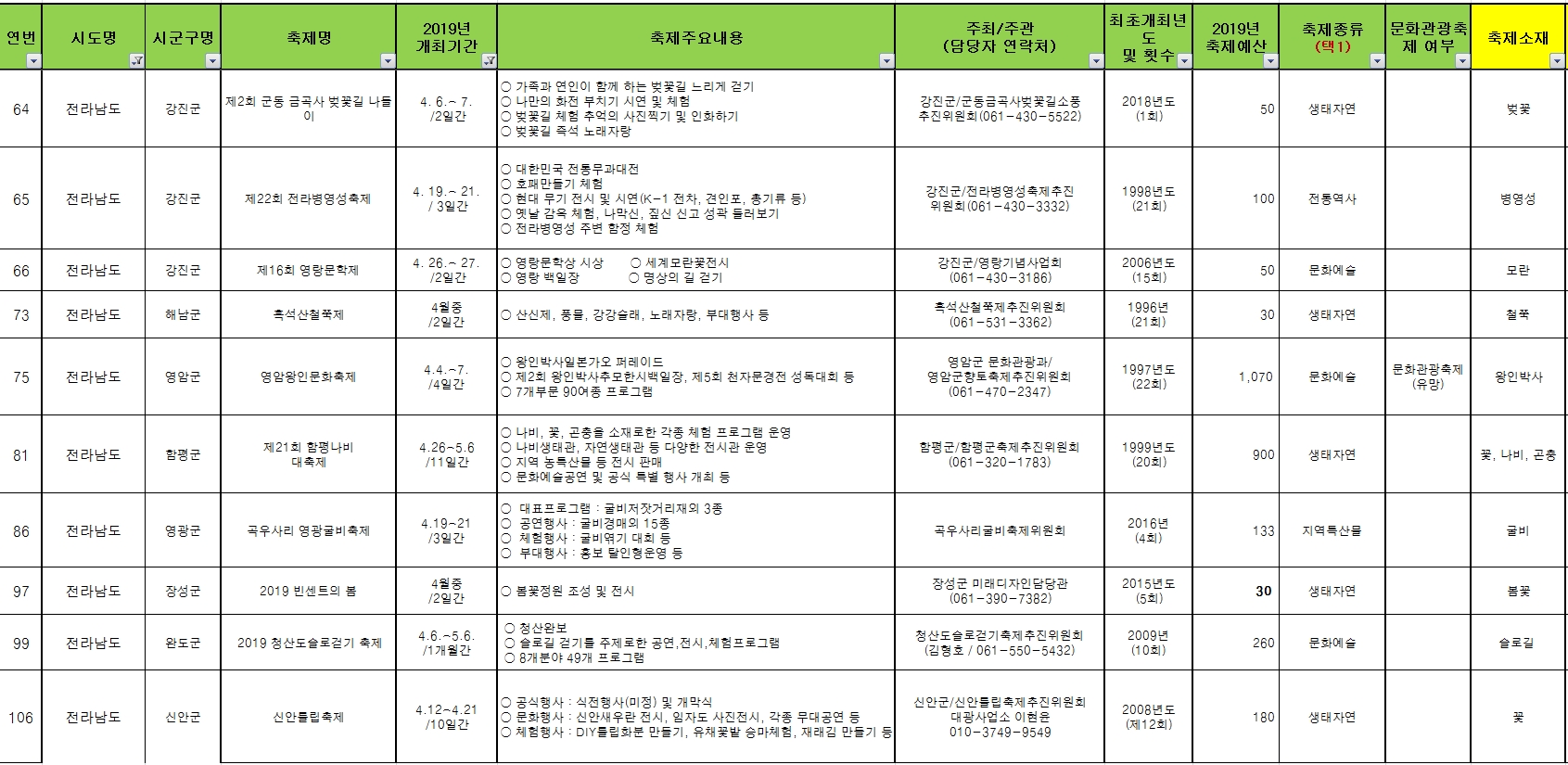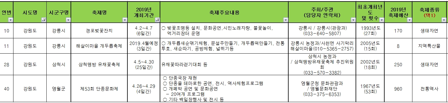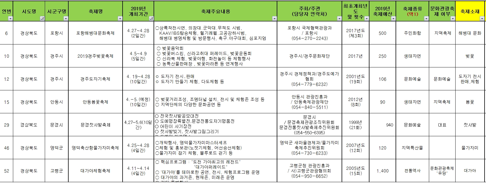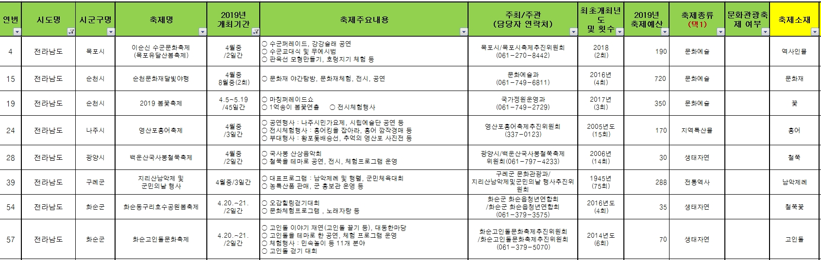 아래 자료는 문화체육관광부 홈페이지에서 다운 받아 4월달 축제만 정리한 자료입니다.