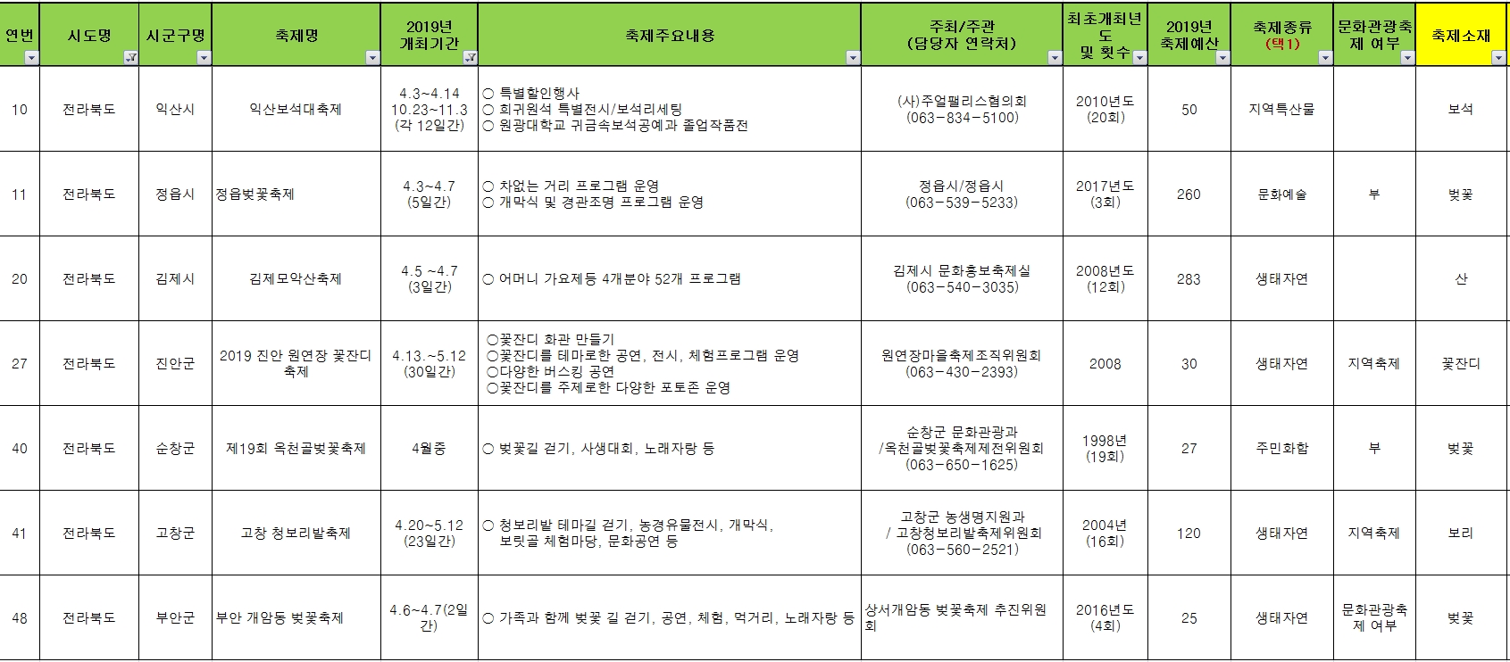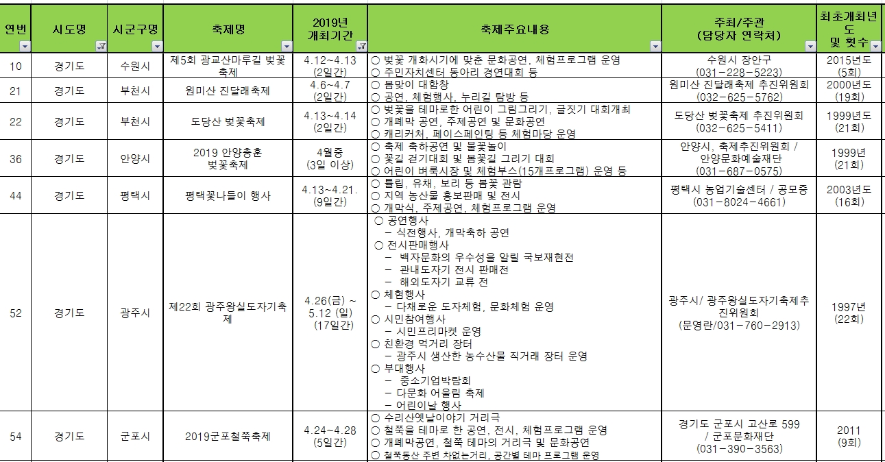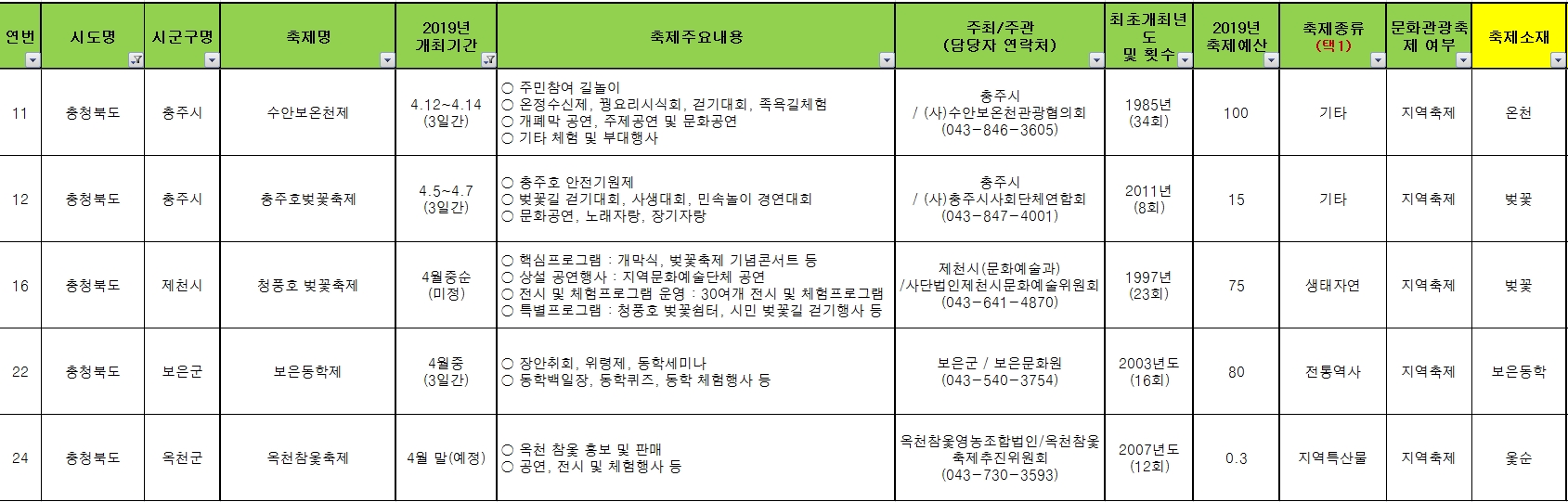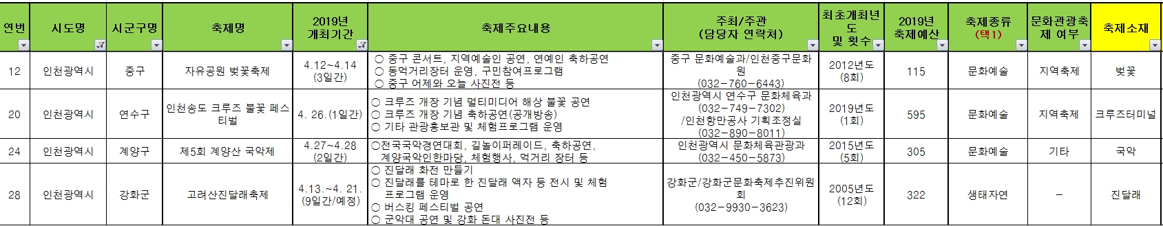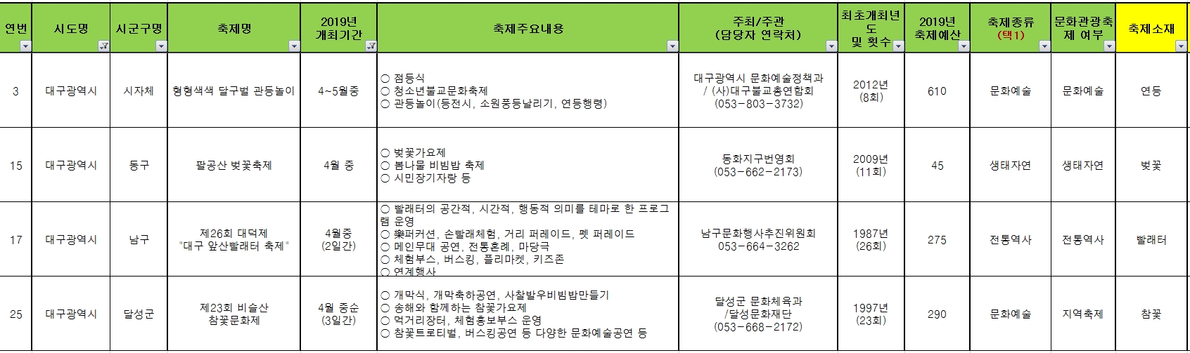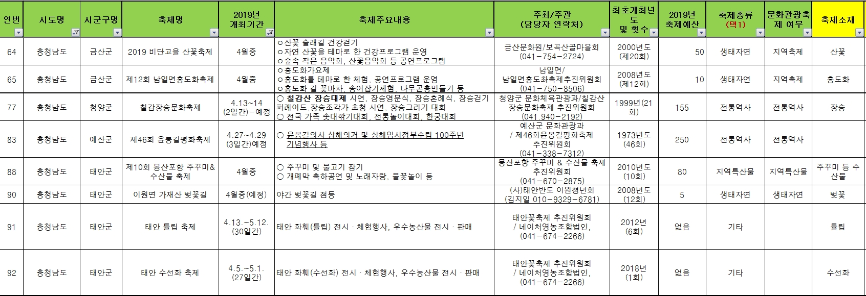 아래 자료는 문화체육관광부 홈페이지에서 다운 받아 4월달 축제만 정리한 자료입니다.