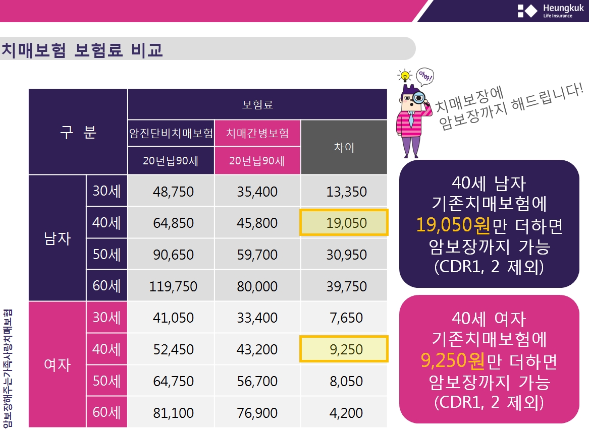 기존의 흥국생명 치매간병보험과 흥국생명 암보장해주는 가족사랑치매보험을 비교하면 40세 남자는 19,050원 여자는 9,250원만 더하면 암보장까지 가능해집니다.