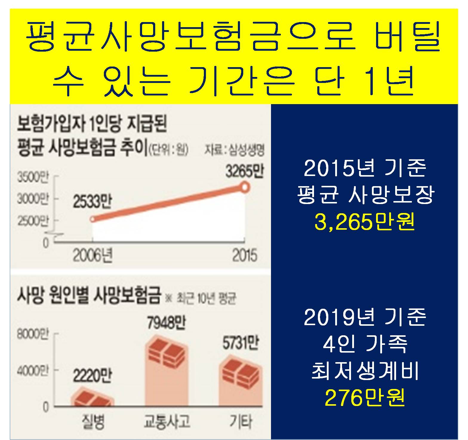 하지만 우리나라 국민들이 가입한 평균 사망보험금 표를 보면... 2015년 기준 사망보험금은 3,265만원으로 남은 가족들의 1년 생활비 정도밖에 되지 않습니다. 그렇기에 아래 표와 같이 자녀의 학창기엔 사망보험금이 턱없이 부족한것입니다.