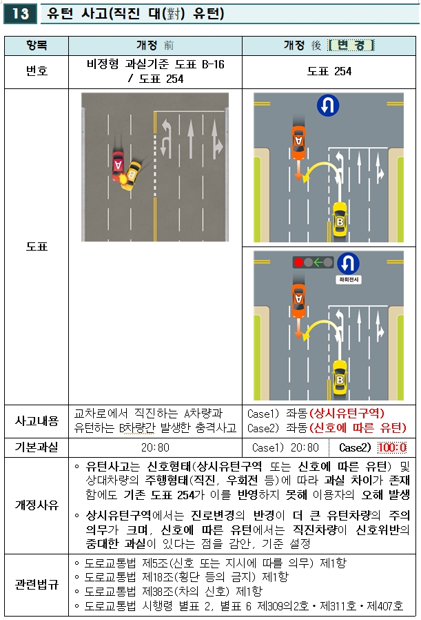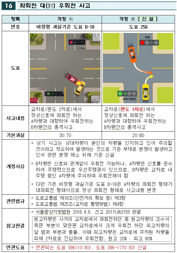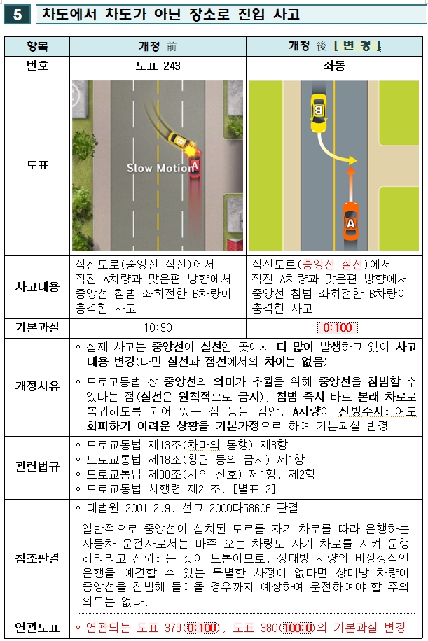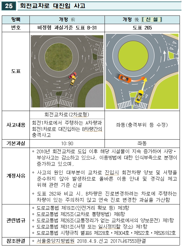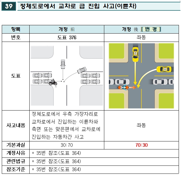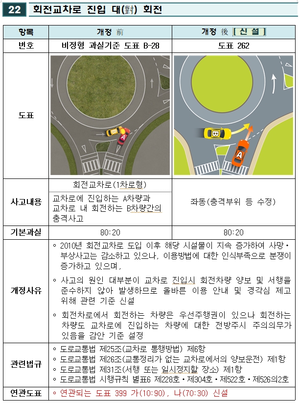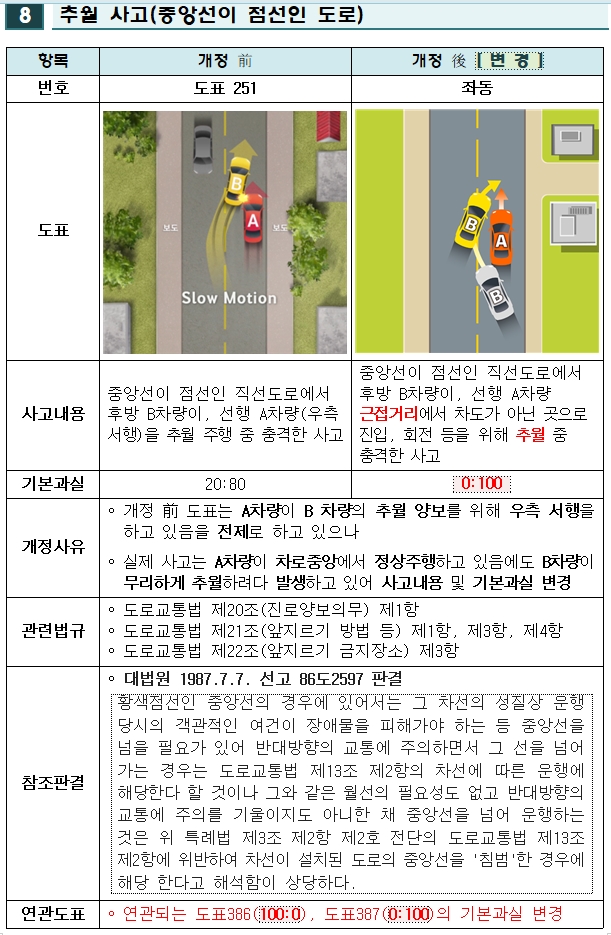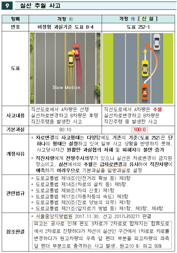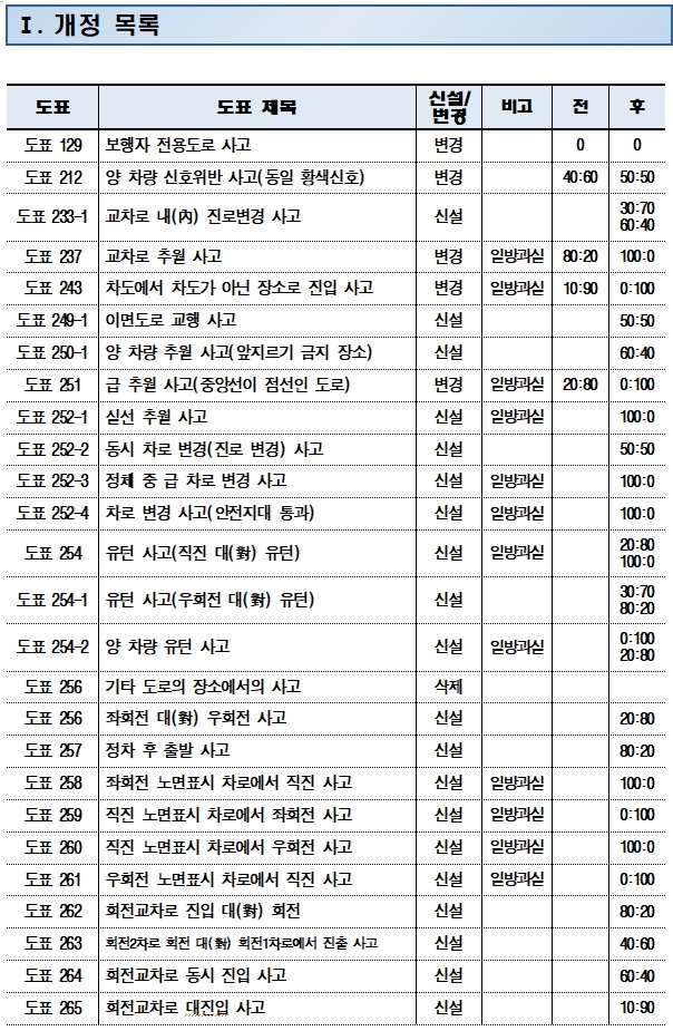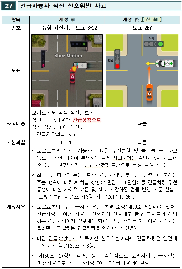 금융위원회 주관으로 자동차사고 과실비율 산정의 신뢰성 회복을 위해 인정기준이 개선되었습니다. 이제는 100:0 비율이 많아졌구요. 응급차량과 이륜차에 대한 과실비율이 새롭게 생기거나, 크게 변동되었습니다. 금융위원회에서 배포한 자료를 모두 캡쳐하여 정보공유 합니다. 또한 보도자료 및 한글문서 파일도 첨부합니다. 감사합니다.