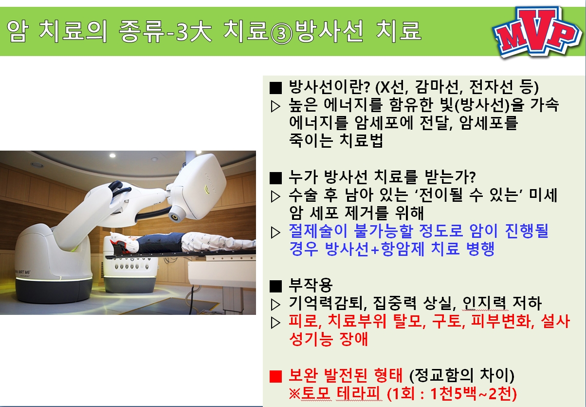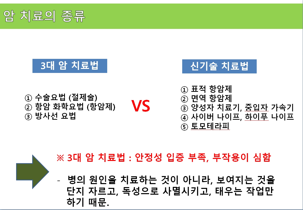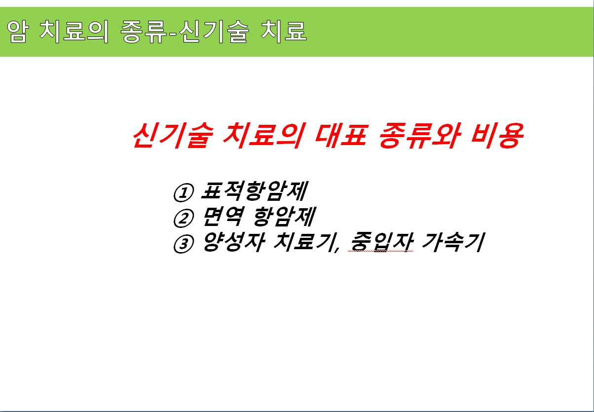 사설이 길었네요. 2013년도엔 전통적인 암치료법만 있었는데... 2019년 현재엔 신기술 치료법이 많이 발견 되었습니다. 안정성도 입증 되었고, 부작용도 없기에 일상생활에 지장을 주지 않습니다. 다만, 치료비(돈)가 문제입니다. 이제는 암치료가 문제가 아니라 치료의 질이 문제입니다. 그 문제의 해결책은 돈입니다. 우리가 암진단비를 1억원 이상 준비해야 하는 이유입니다.