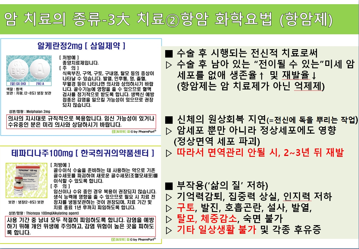 제동생의 경우 백혈병이기에 수술은 불가능 했고, 강력한 항암제를 투여 받았습니다. 단한번 투여에 머리카락이 빠져 엉키면서 어쩔수 없이 머리를 다 밀어야 했습니다. 그리고 구토와 설사, 숙면 불가로 일상생활에 막대한 지장이 있었습니다. 매일매일 봉화산을 오르며 큰나무에게 빌었고, 체력과 면역력을 높이기위해 식단(건강보조식품)과 운동을 병행했습니다. 그렇게 2년정도 투병 생활을 하고 다시 직장생활에 복귀할수 있었습니다.