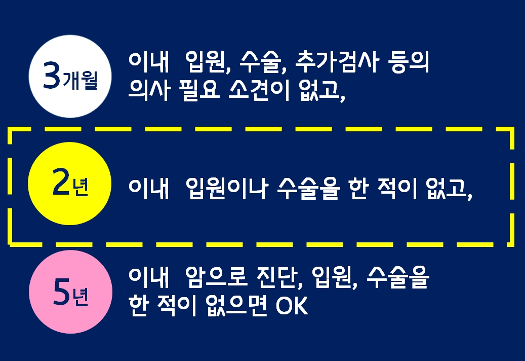 여기서 가장 많이 걸리는 부분이 2년이내 입원/수술인데... 아래의 경우로 해당되는 경우는 가입이 가능합니다. 2년이내 입원/수술 한 경우라도 저에게 물어보면 정확하게 확인해 드리겠습니다.