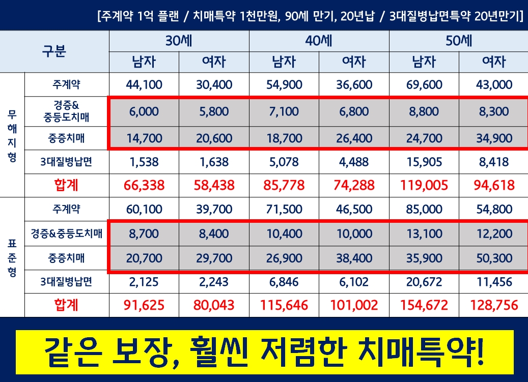 55세이하라면 착한종신 7080형에 치매특약 부과하여 보장 받다가 80세에 해약하여 원금 받으시면 공짜로 보장 받는겁니다.