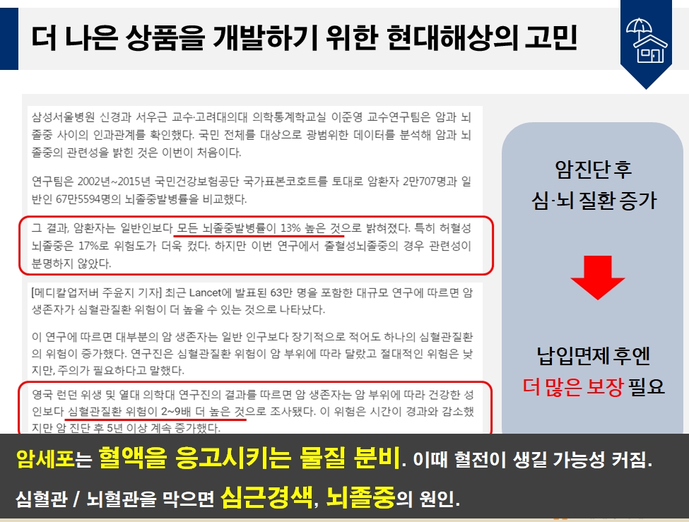 암환자는 일반인 보다 모든 뇌졸중 발병률이 13% 높은것으로 밝혀졌다고 하네요. 특히 허혈성 뇌졸중은 17%로 위험도가 더욱 크고, 심혈관질환 위험은 2~9배 더 높은것으로 조사 되었답니다. 암진단 후 뇌혈관이나 심혈관 질환에 걸릴 확률이 더 높다는 겁니다. 2배 보장해주면 좋겠죠.