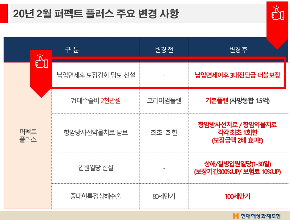 현대해상에서 또 앞서가네요. 20년 2월 주요 변경사항 중에 가장 눈에 띄는 담보가 납입면제 후 보장강화 담보가 신설되었습니다. 업계최초이며 획기적입니다.