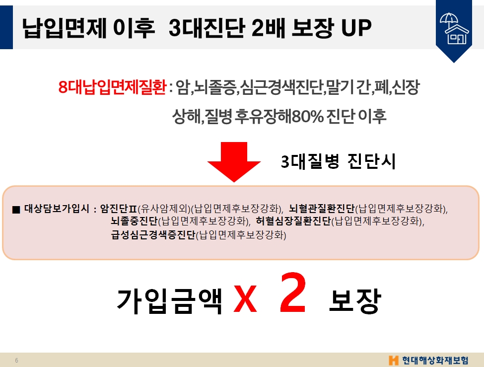 암, 뇌, 심장에 관한 진단비가 납입면제 이후에는 무조건 더블로 보장이 UP 됩니다!!!