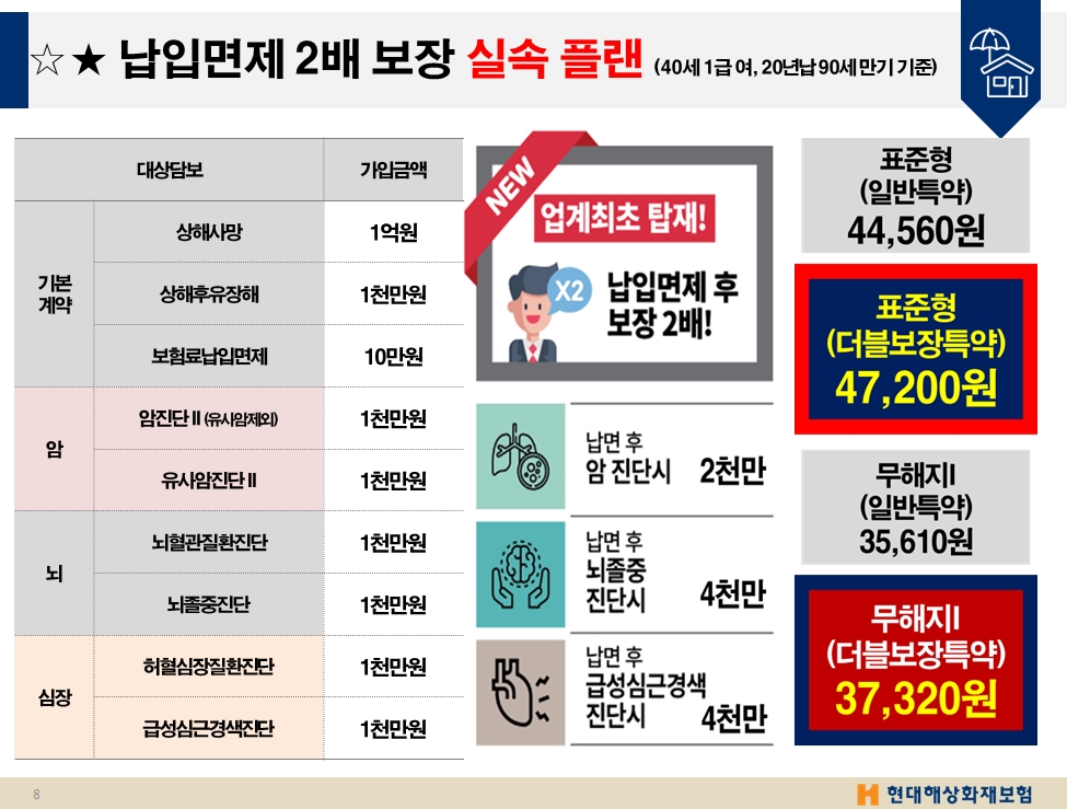 납입면제 2배보장 실속플랜으로 암, 뇌, 심 모두 1천플랜으로 40세 여자 기준으로 일반특약은 보험료가 44,560원인데... 더블보장특약은 47,200원으로 2,640원 차이로 보장이 더블이 됩니다.