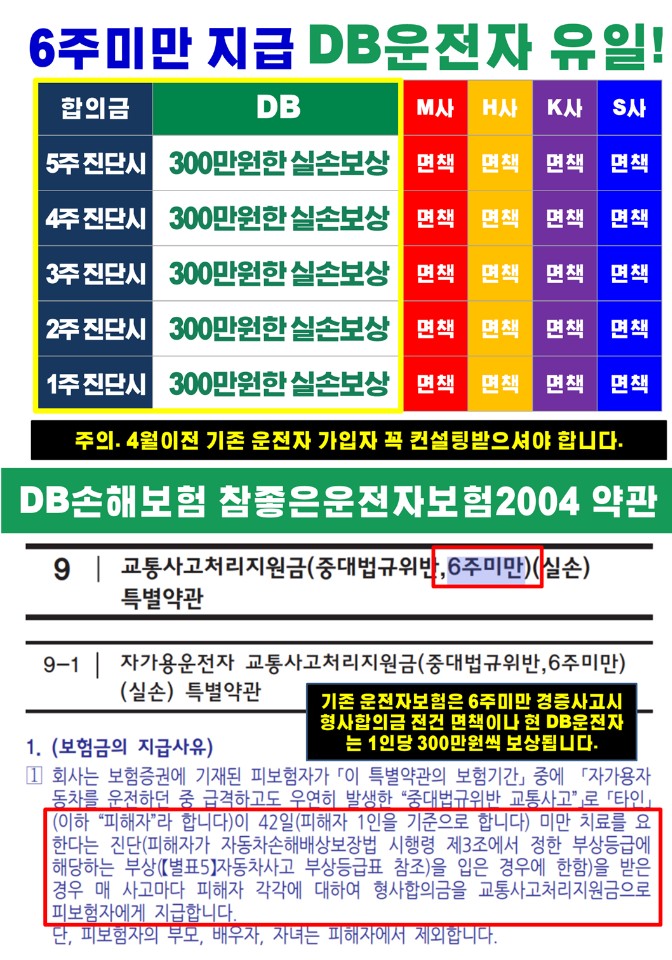 운전자보험이 2개면 6주~10주 사고시 형사합의금이 두개의 보험으로 한도가 높아집니다. 물론 새로 가입한 운전자보험에서 6주미만 사고도 보상이 되는거구요.