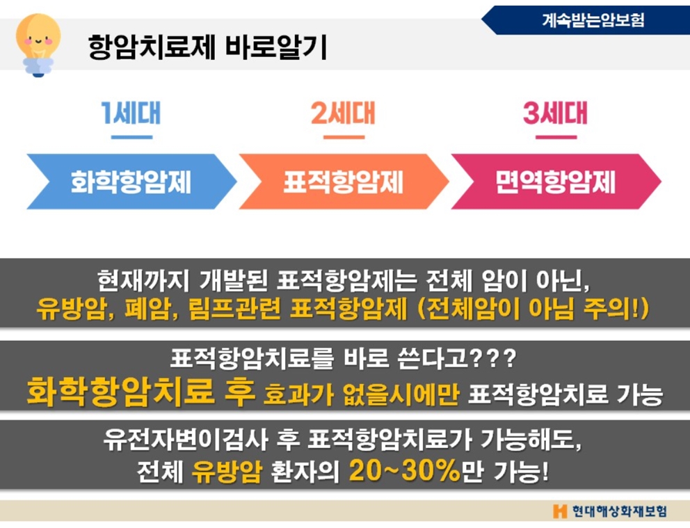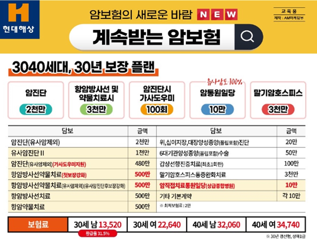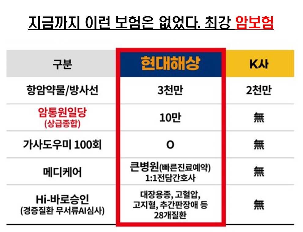 암보험이 계속 진화를 하네요~~ KB손보의 표적항암치료를 보장하는 암보험이 출시 되었는데... 이번에 현대해상에서 KB손보를 겨냥해 포괄적 항암방사선약물치료비와 암통원 무제한과 가사도우미 100회를 내세워 반격을 했습니다. 보험료도 업계 최저로 저렴하여 기존에 암진단비가 있으신분들에게 업셀링용으로 아주 좋다고 생각되어 추천합니다.