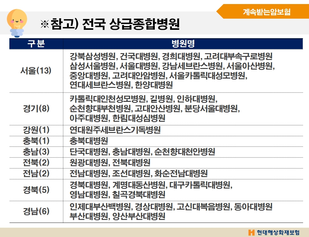 포괄적 항암약물/방사선 치료비와 암통원일당(상급종합병원), 가사도우미 100회가 현대해상 계속받는 암보험의 장점입니다.
