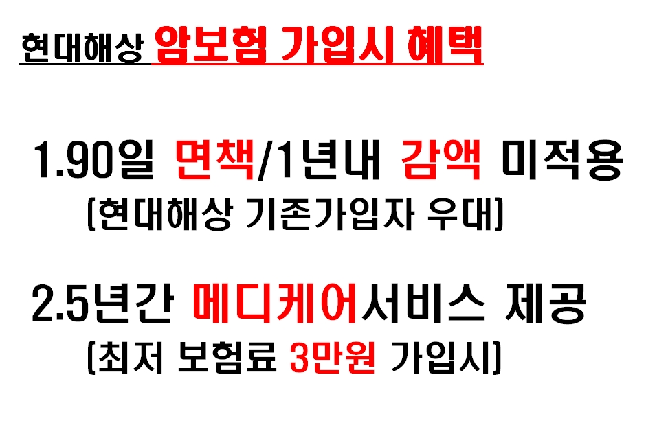 제일 먼저 기존에 현대해상에 보장성보험으로 어떤 보험이라도 있는 고객이라면... 암보험 가입 후 90일 면책기간, 1년이내 감액기간을 면제해 드립니다. 또한 5년간 메디케어 서비스를 제공해 드립니다.