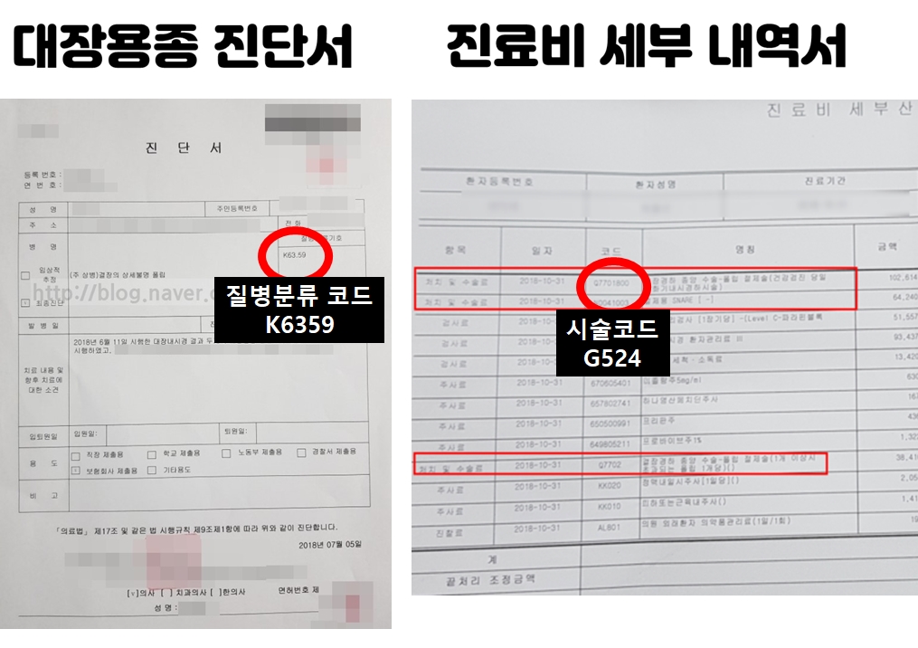 보험금 청구시엔 진단서와 진료비세부내역서를 함께 제출해야 합니다. 진단서에는 질병분류코드를 진료비세부내역서에서는 시술코드를 확인하여 수술비를 지급합니다.