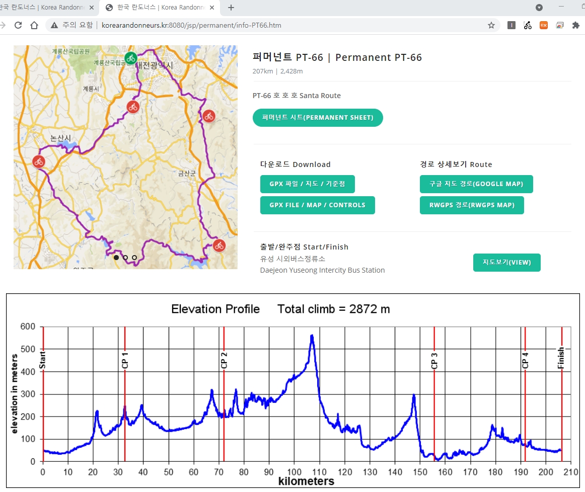 퍼머넌트 PT-66 거리 207Km 누적고도 2,428m 제한시간 13시간 48분짜리 라이딩을 총소요시간 10시간 10분만에 완주했네요. 라이딩시간 8시간 34분 휴식시간 1시간 36분 이었습니다.