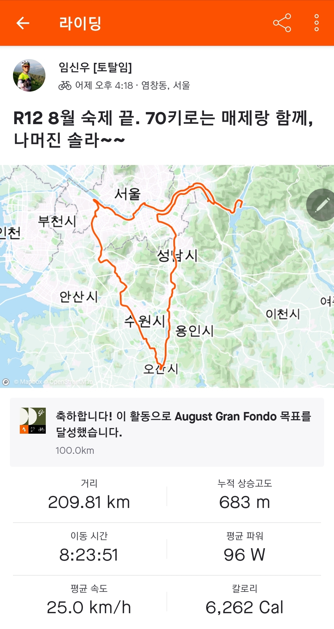 8월 28일 일요일 오후 4시 22분 출발 29일 오전 2시 51분 도착! 총 소요시간 10시간 29분 걸렸네요. 라이딩 시간만 보면 8시간 24분 페달링 했고, 쉬는 시간은 2시간 5분 이었습니다. 핸드폰 방전만 아니었으면 목표 달성 하는건데... ^^ㅎㅎㅎ