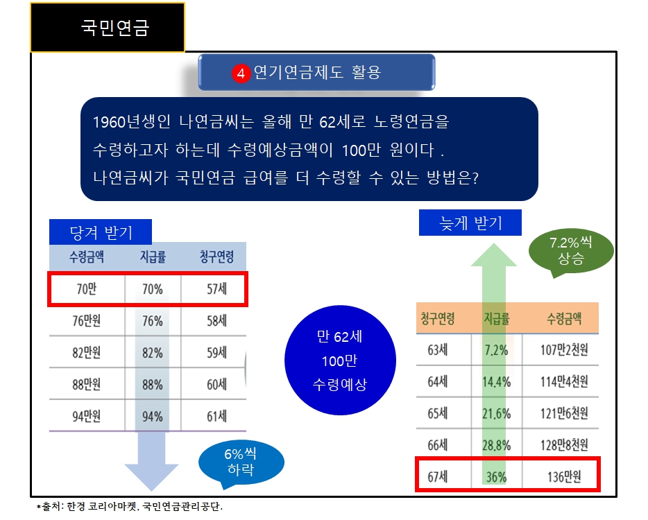 4 연기연금제도 : 매년 7.2%씩 증액됨.(최장 5년까지 가능함), 조기수령은 6%씩 하락됨. (나의 건강상태를 고려해 선택하라. 연금은 오래 받을수록 좋은겁니다. ^^ㅎㅎㅎ)